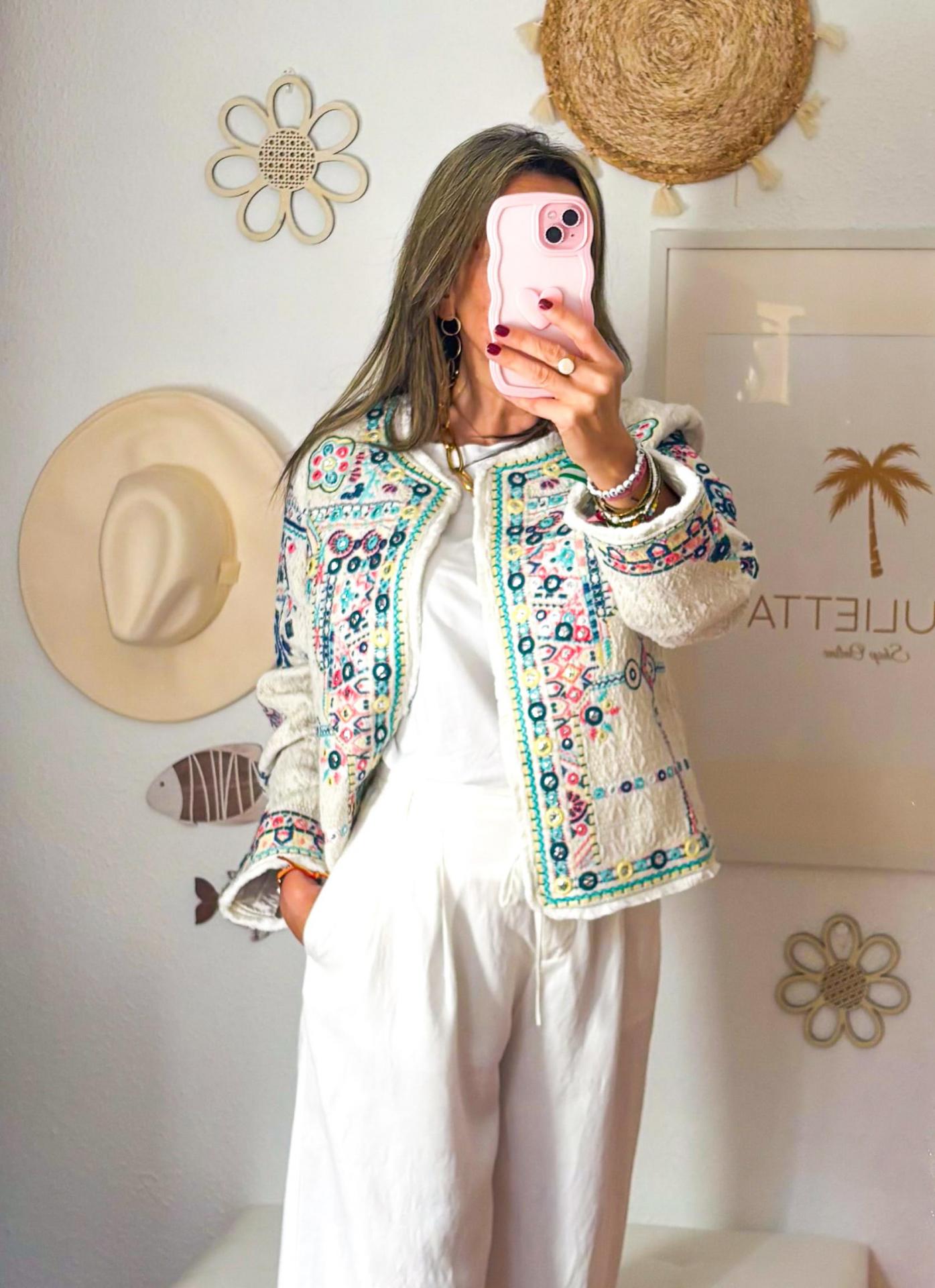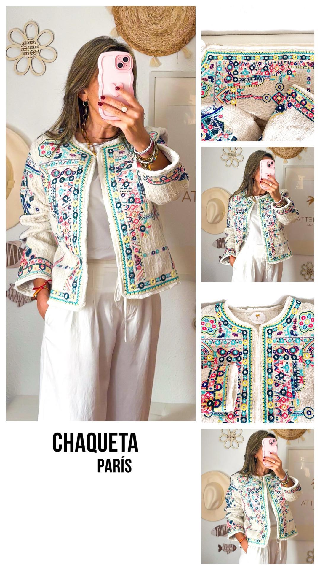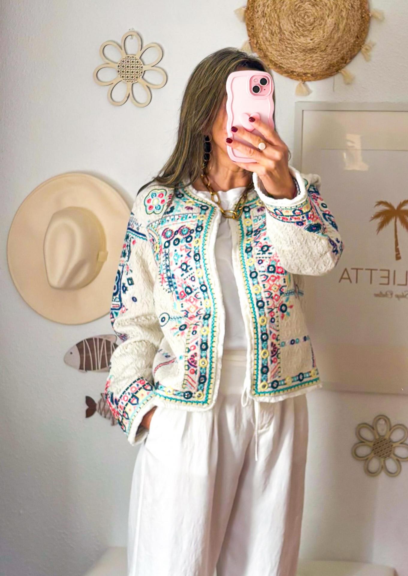 Tono beige con bordados e hilos en turquesa, amarillo, azul marino, fucsia, verde.