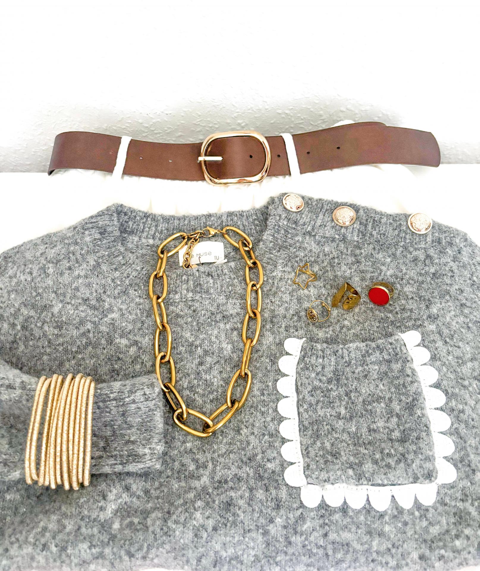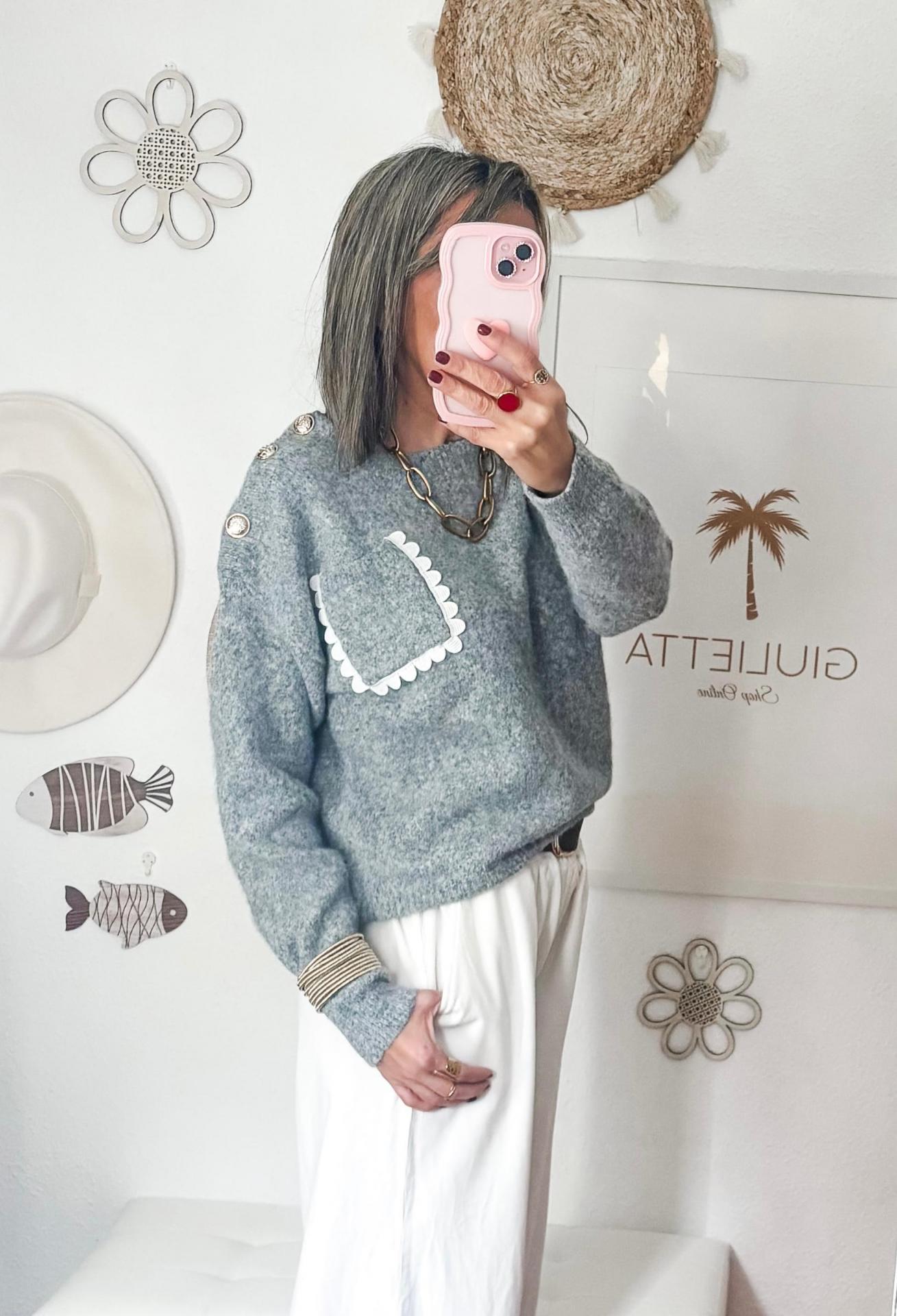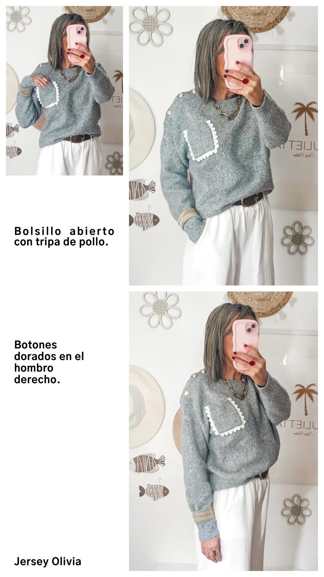 Tres botones marineros dorados en el hombro izquierdo.
