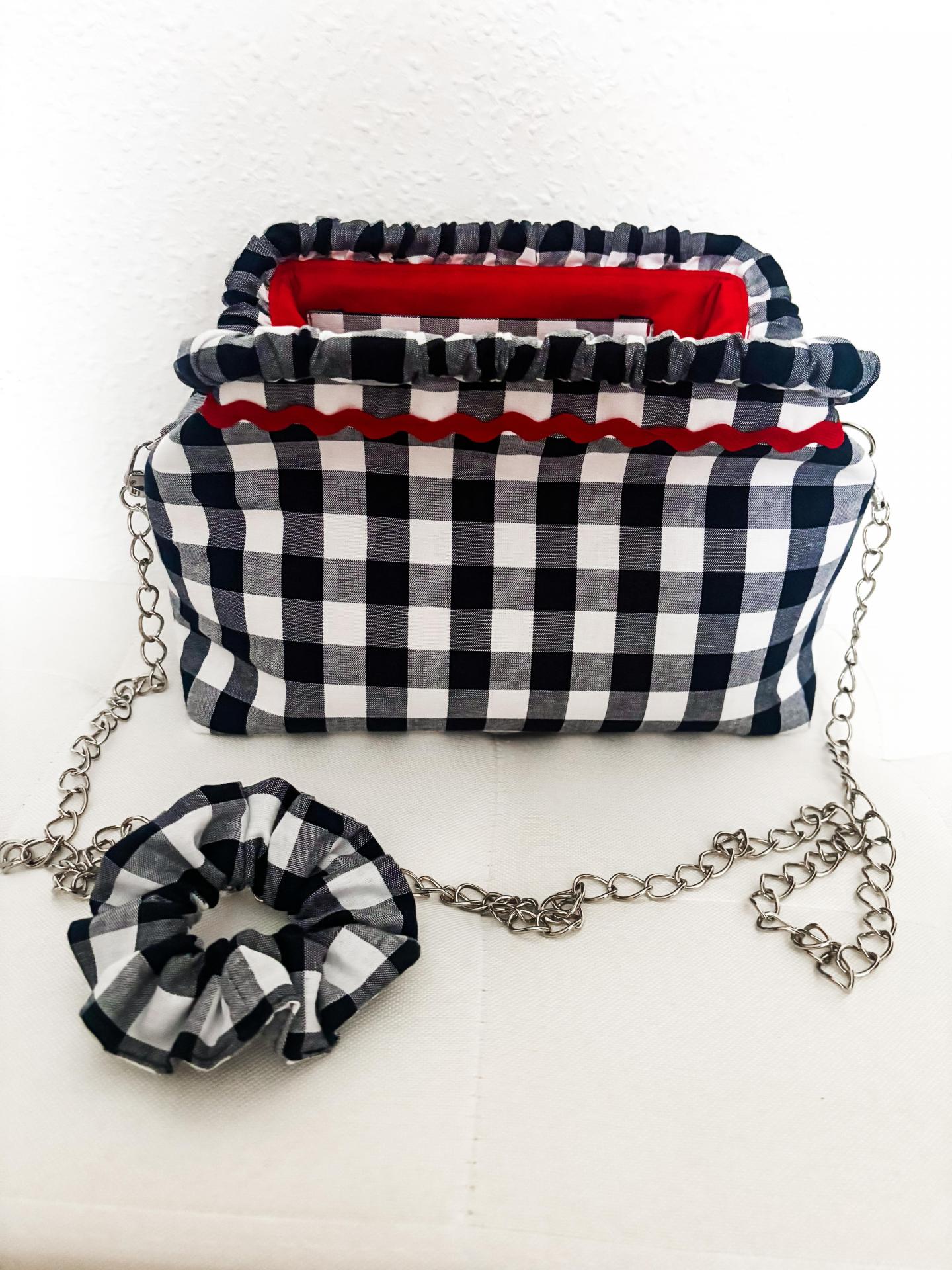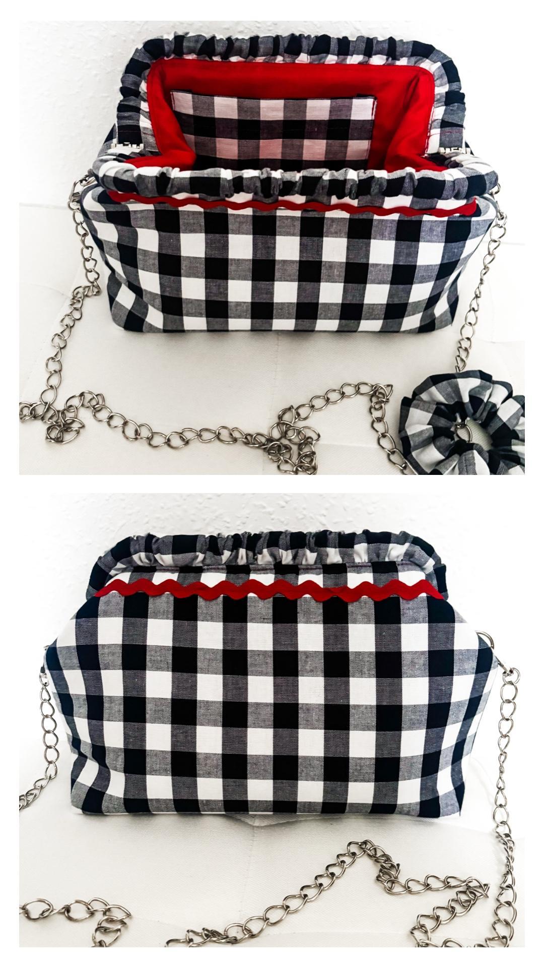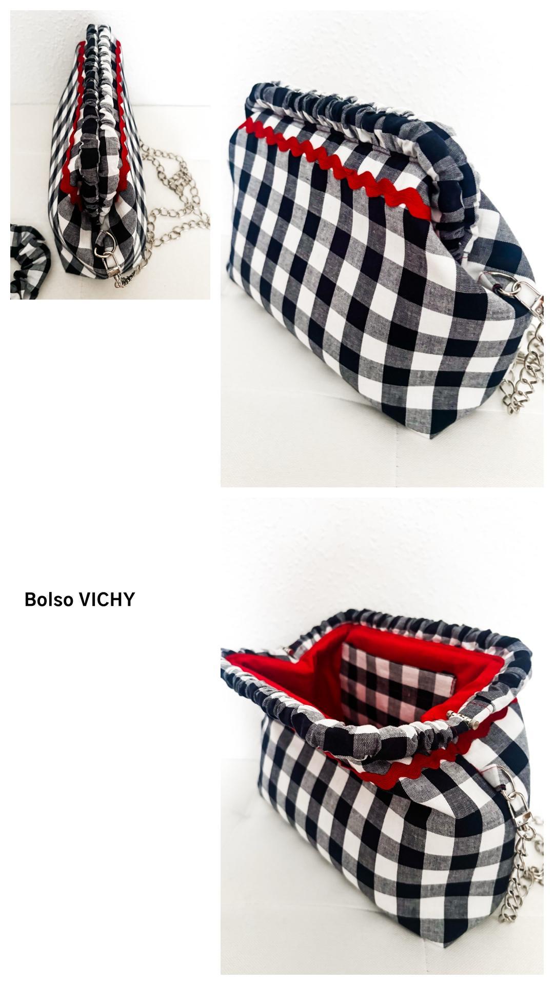 Interior forrado en rojo con bolsillo interior en cuadros de vichy azul marino y blanco.