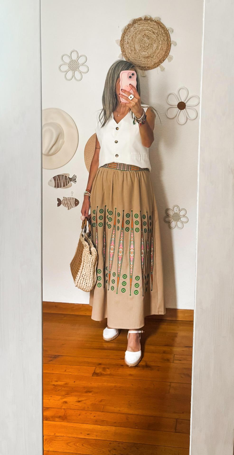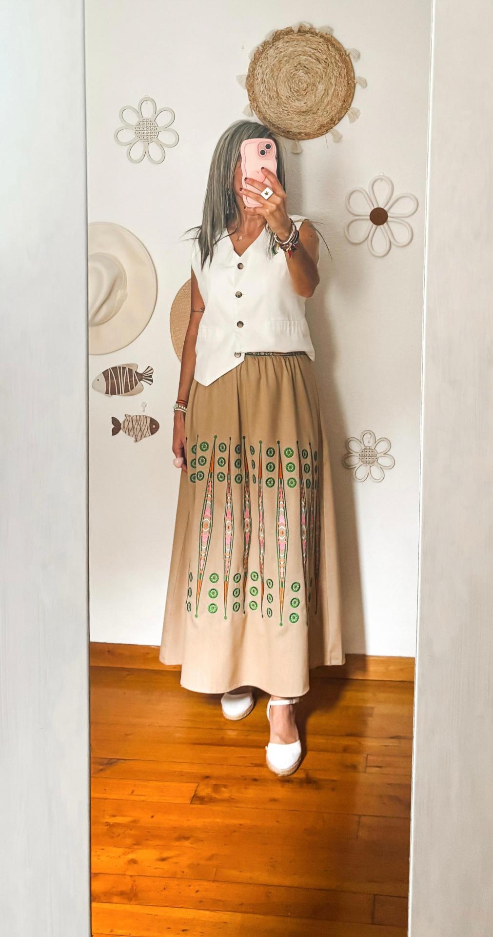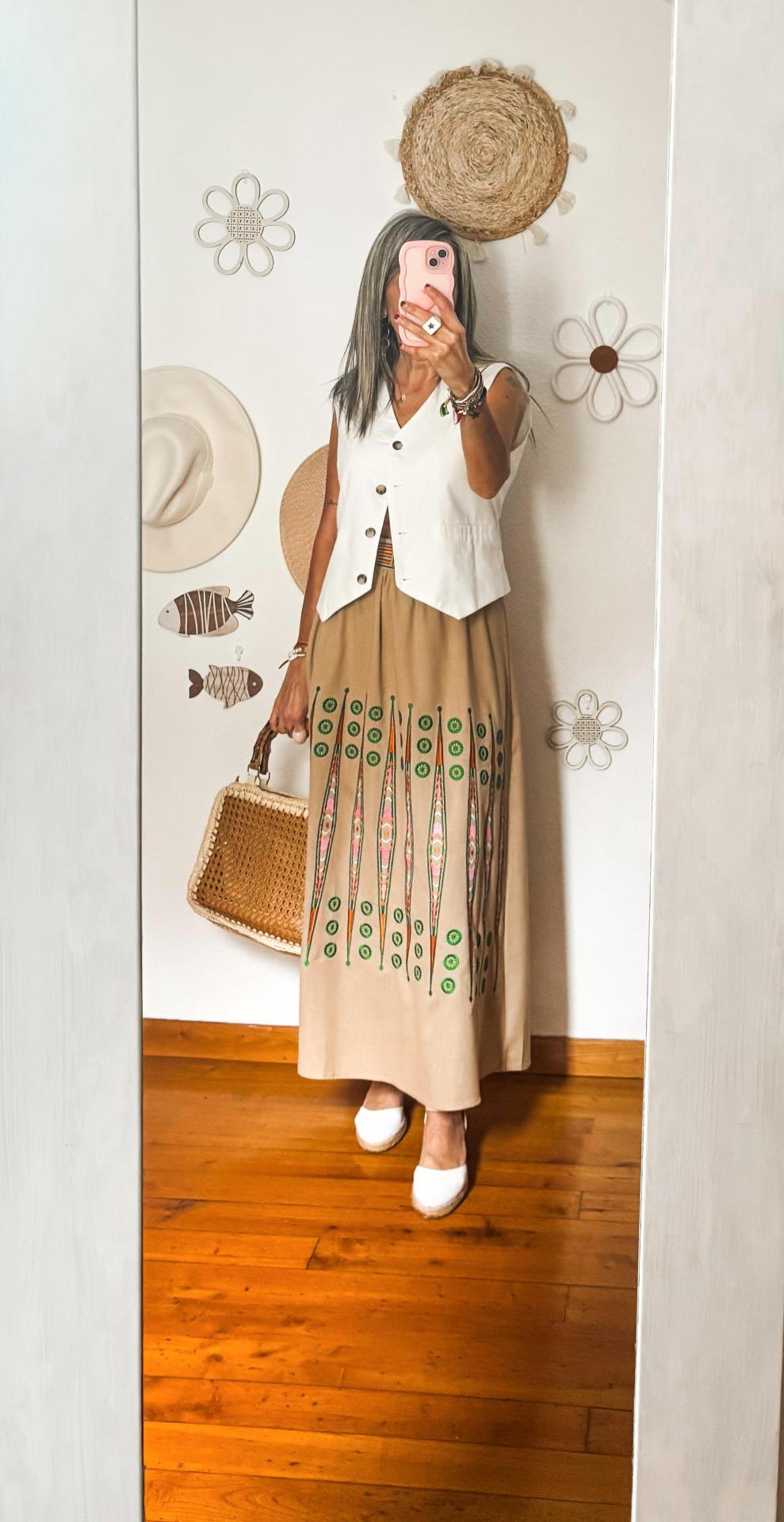Cintura con bordados y parte de atrás engomada. Cremallera en un lateral.