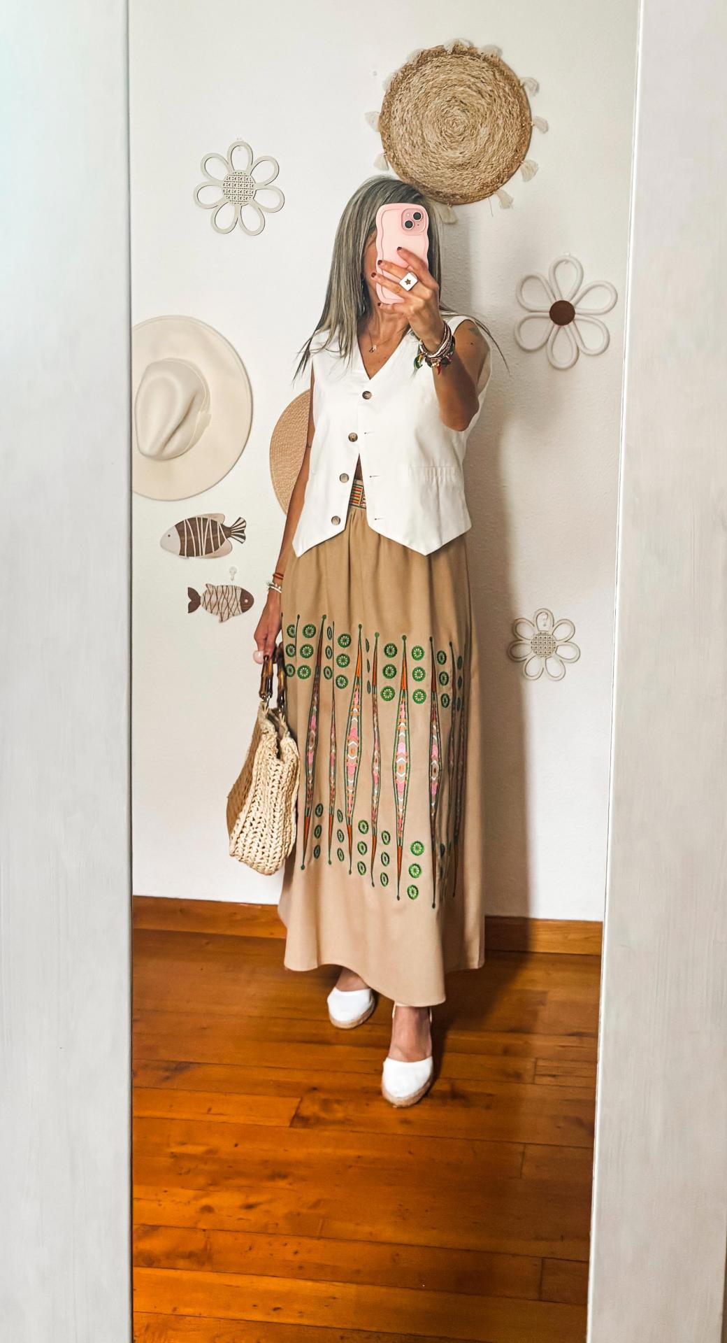 Toda la parte delantera de la falda con bordados en verde, rosa, naranja...