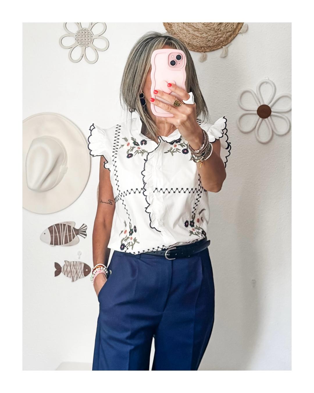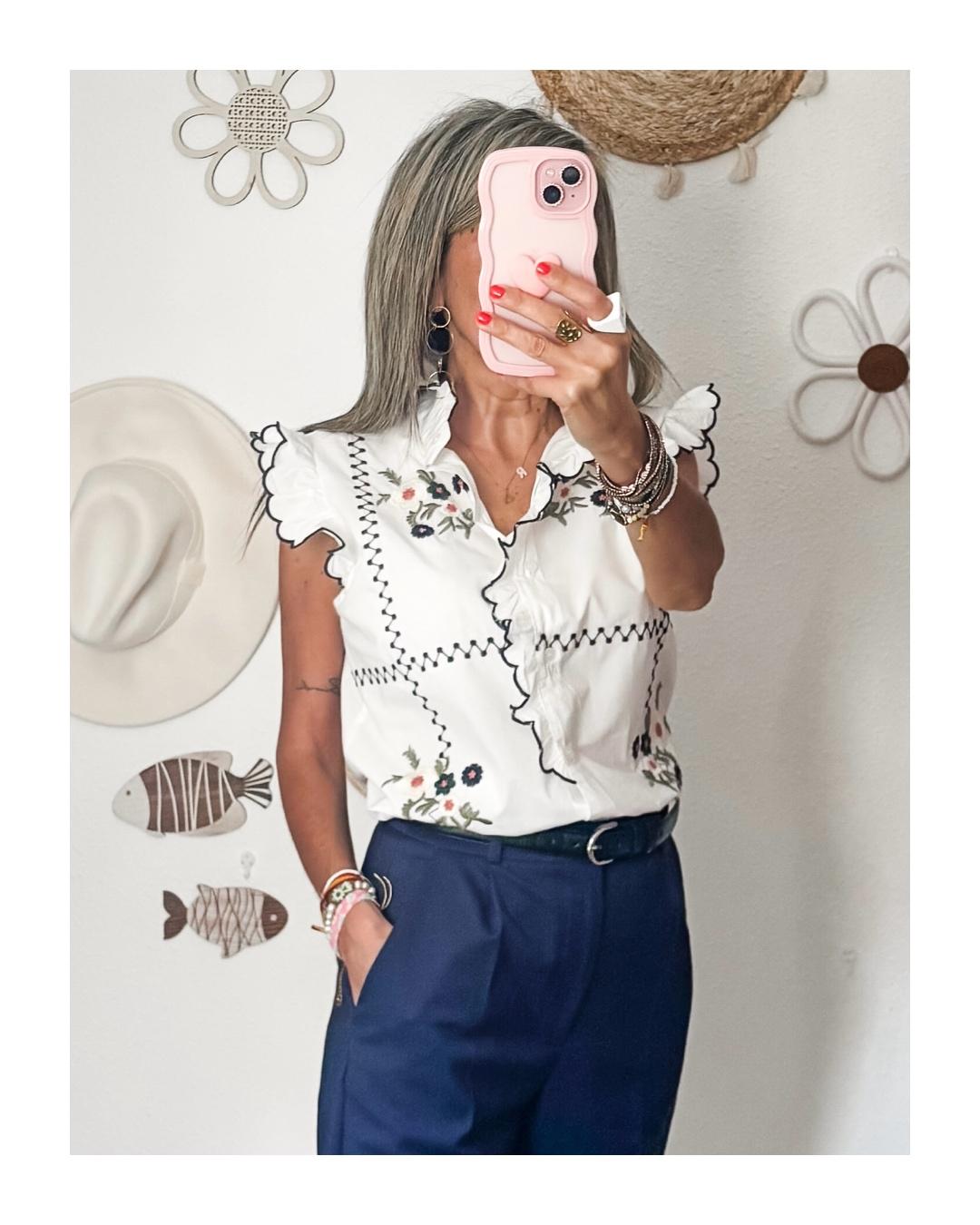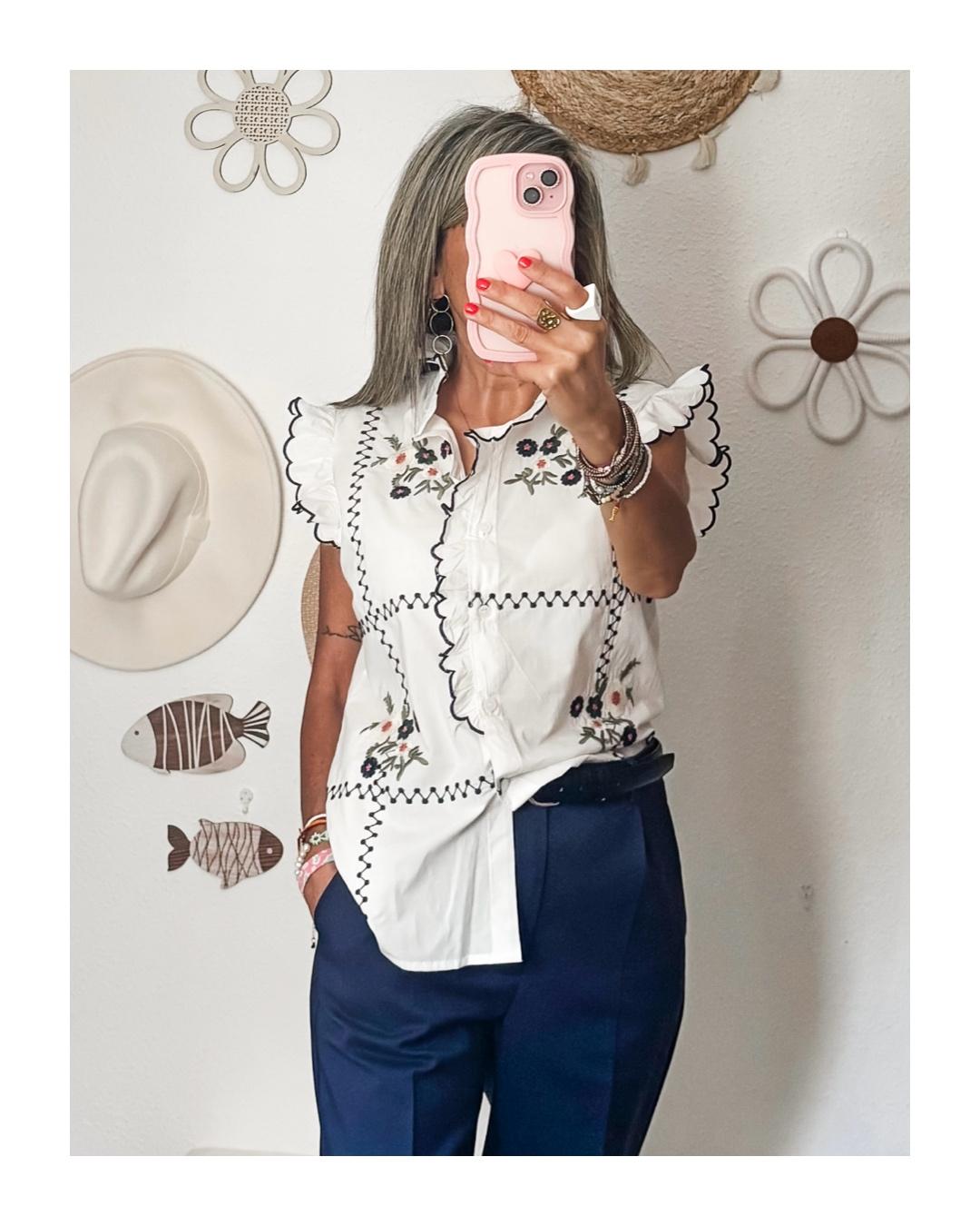Lleva botones, volantes y detalles bordados.