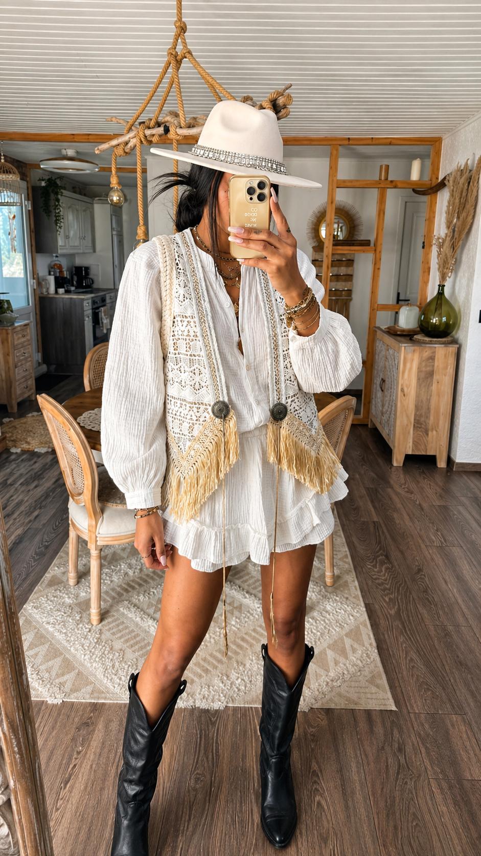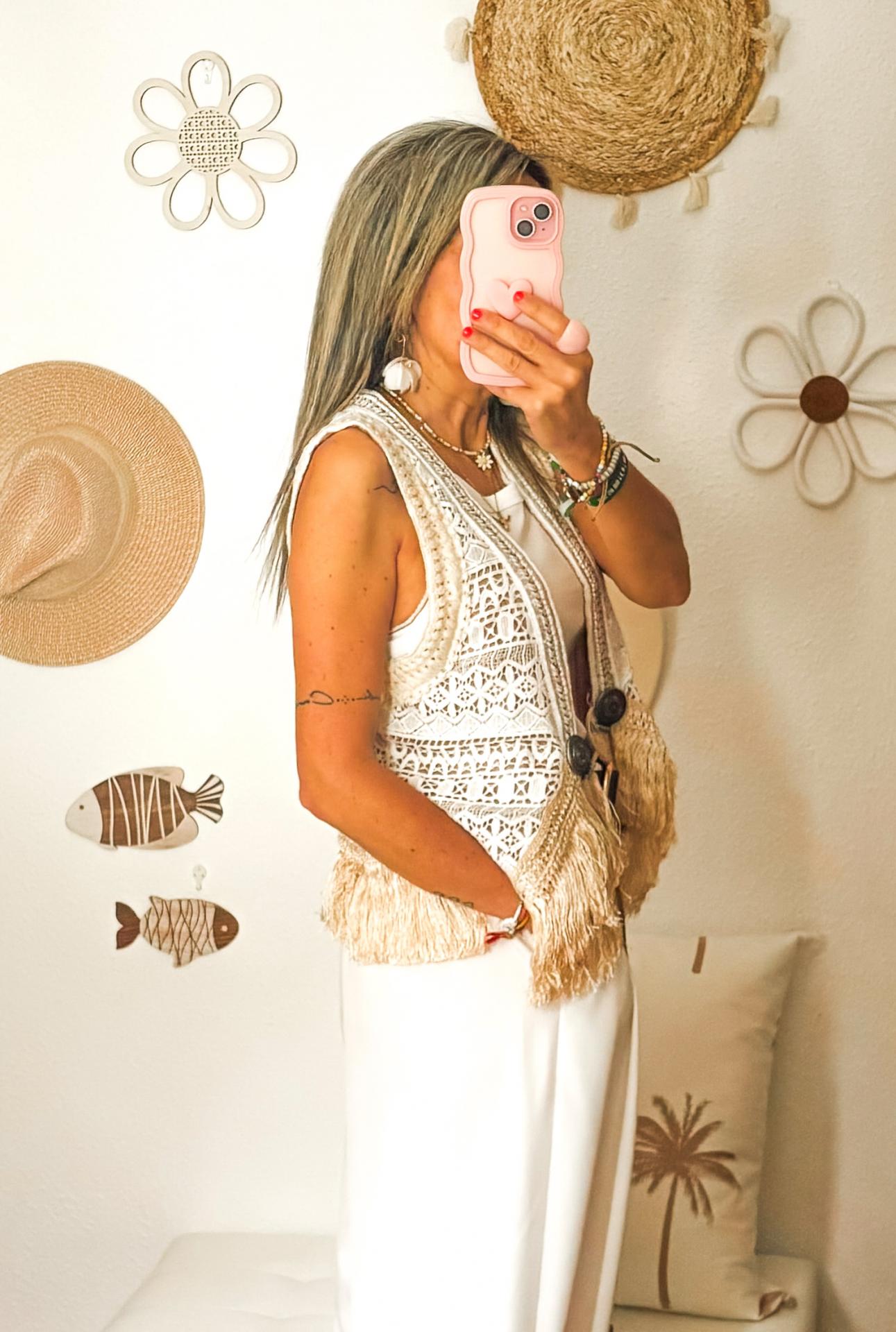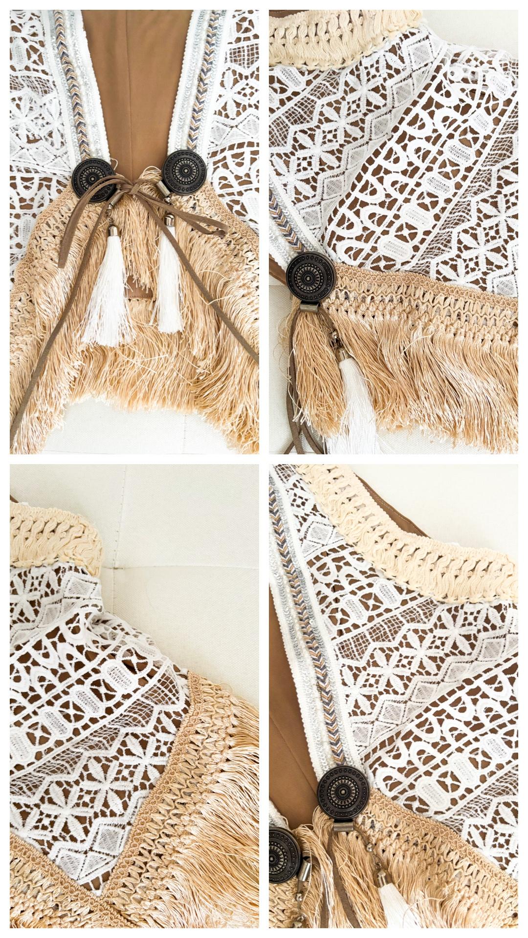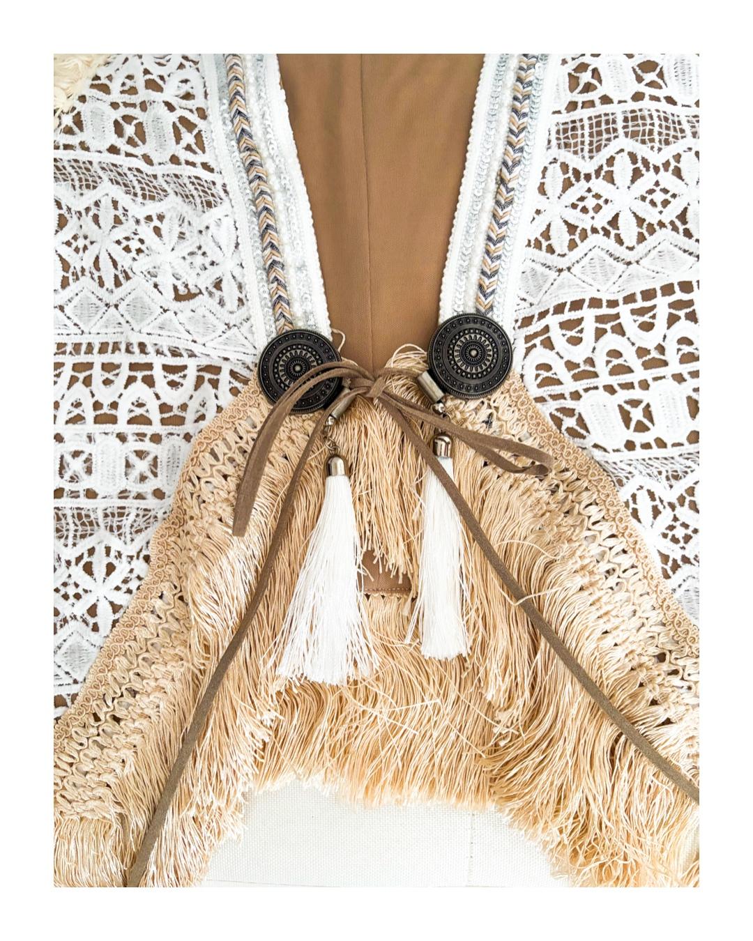 Dos botones en bronce para llevarlo abierto o abrochado.